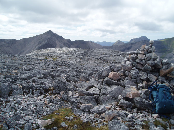 Stone slabs on the summit plateau of Ruadh-stac Beag, with Beinn Eighe beyond.