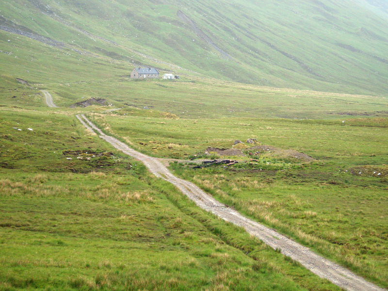 Glenuaig Lodge, 9 km from the nearest public road. When I got there I was shocked to find that mindless vandals get to even these remote parts. Several of the windows in the lodge had been smashed, with large rocks thrown through.