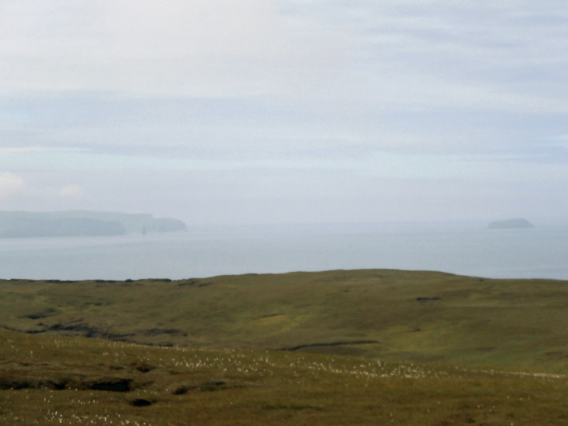 A very hazy view down the coast to to Sandwood Bay and the island of Am Balg.