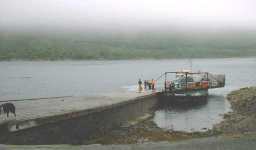 The minuscule car ferry arrives at Glenelg. Skye is almost hidden in low cloud.