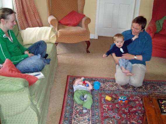 A wet morning in the cottage: Pippa and Alison with Finlay and Lewis.