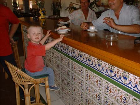We stayed at the Venta Los Arrieros as usual, and for the first few evenings Steve, Jo and Tommy came to join us there for dinner. Tommy was very taken with the bar at the hotel. He has learned to ask for jamón, whereupon Antonio the bartender serves him his favourite snack. When Antonio first saw Tommy he tried to greet him with a "high five". Tommy was frightened by Antonio's upraised hand, so we had to demonstrate to him what was expected. After a while, Tommy got the idea and raised his own little hand to meet Antonio's. Later, I took Tommy up to our room, and as we left the bar I said to him, "That Antonio's a strange man, isn't he?" Tommy thought about this for a bit and then started chanting "Strange man! Strange man!", all the way up the stairs and along the corridor to our room.